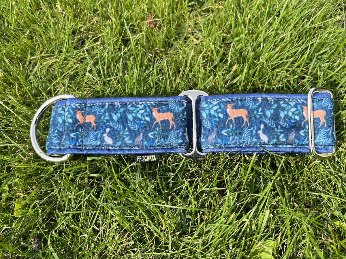 Elegantní softshellový obojek s motivem barevného lesa se stříbrným kováním, který ozdobí každý jemný psí krček.