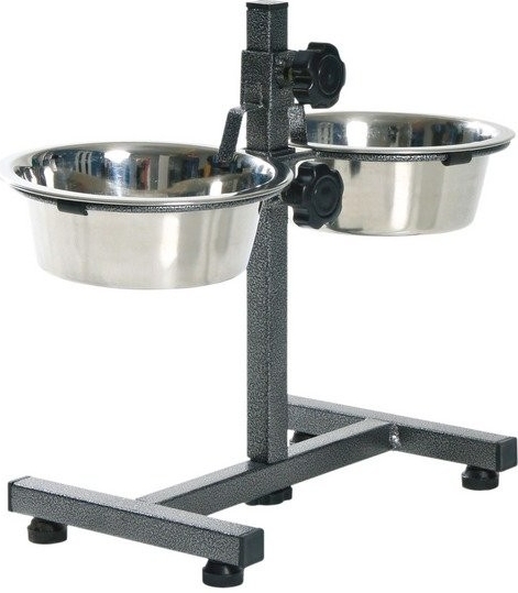 2 nerezové misky o objemu 4,0 l a průměru 29 cm s nastavitelným stojanem až do výšky 60 cm. Kovový stojan s nohou je ve tvaru H, kerý optimálně udržuje rovnováhu. Pes takto může dostat krmení v pro něj ideální výšce, aniž by se přitom musel shýbat a zatěžovat tak svou páteř. Výškově nastavitelný stojan zmírňuje zažívací problémy psa, a to díky vyvýšení misek, které umožňují optimální držení těla.