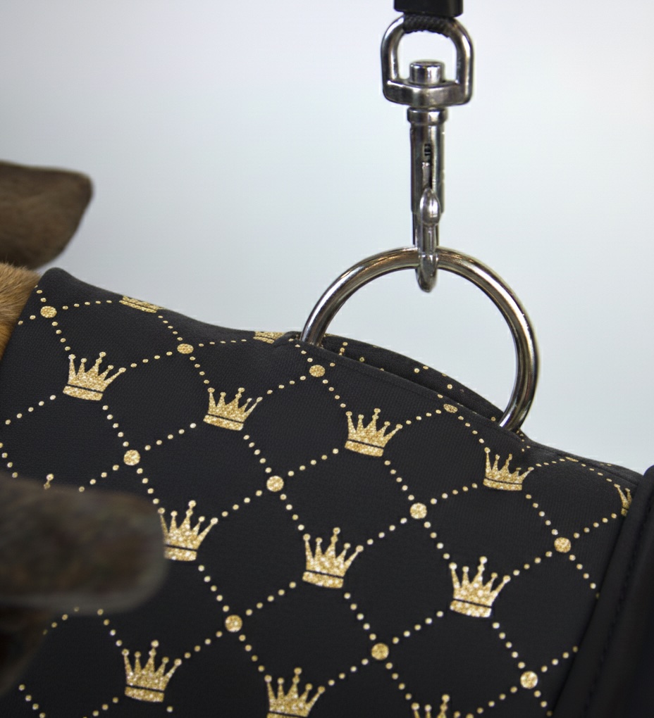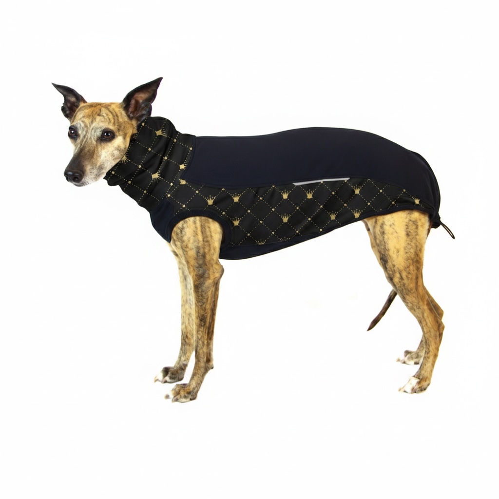 Pohodlný a moderní svetřík pro psy je vyroben z kvalitního úpletu s vesmírným potiskem se vzorem zlatých korunek na černém pozadí - elegantní a luxusně vypadající vzor. Svetr tvoří 2 vrstvy: spodní vrstva je tvořena viskózovým úpletem, který dodává oblečení funkčnost, velmi příjemný a jemný materiál a dokonale se přizpůsobí hrudníku psa a to i v době růstu. Horní vrstva je tvořená úpletem s teflonovou úpravou, je tedy vodoodpudivá. Svetr je nositelný samostatně pro svou pevnost a hřejivost, ale také jako podvlek pod bundu do opravdu chladného počasí.