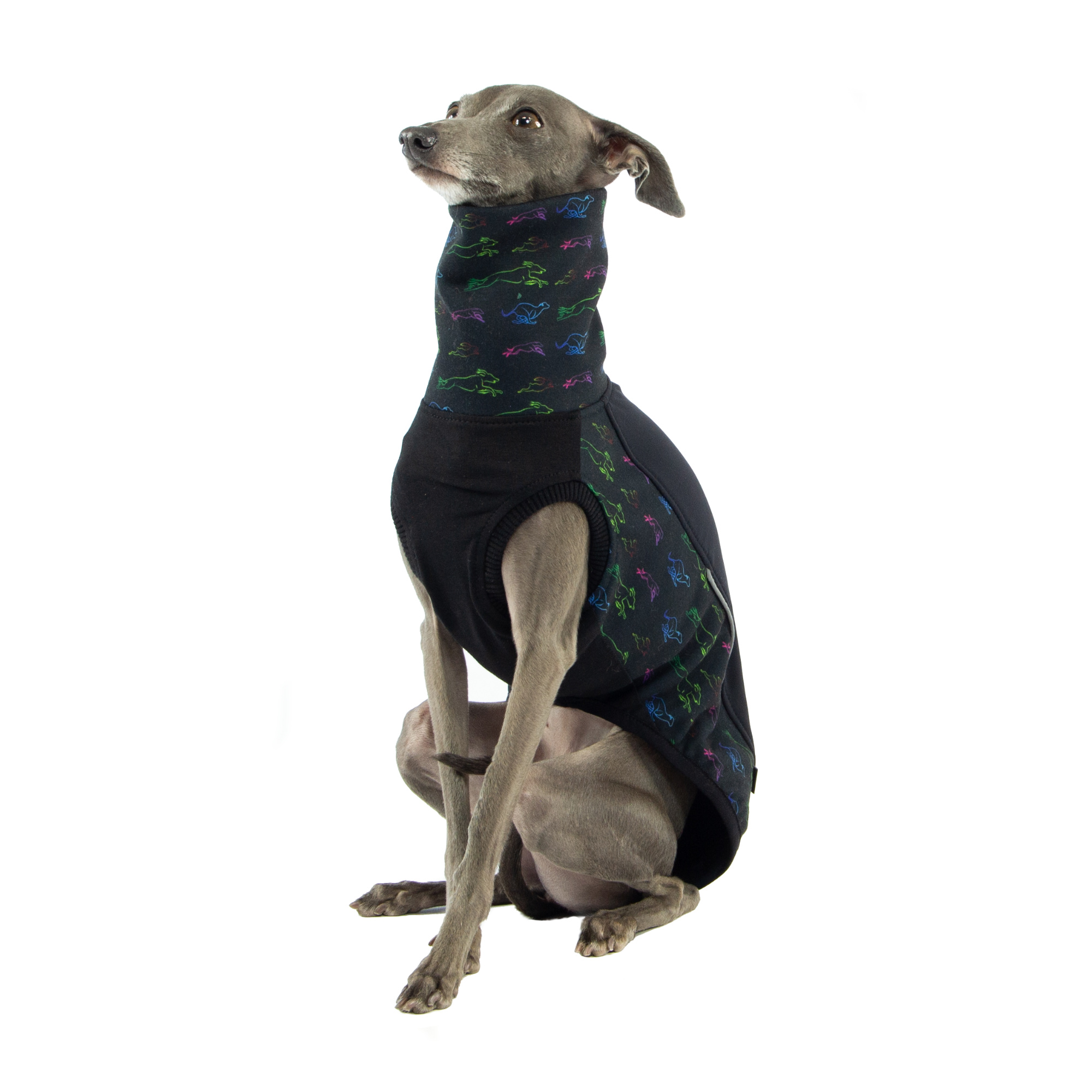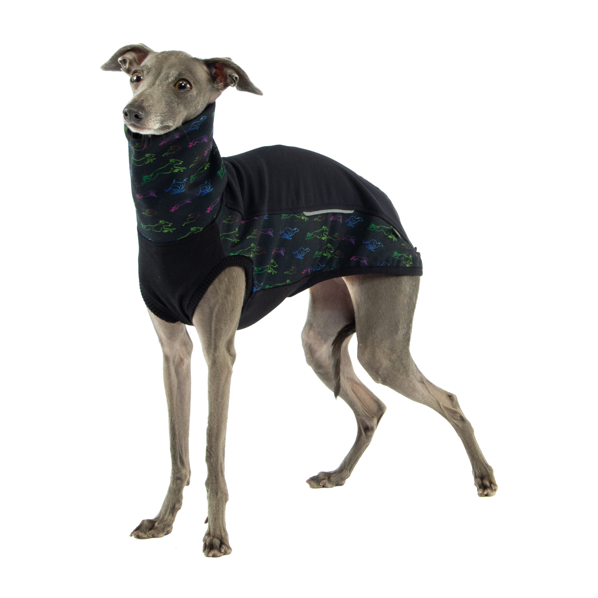 Pohodlný a moderní svetřík pro psy je vyroben z kvalitního úpletu s autorským motivem chrtů v duhové barvě, na oblečku se vám tak proběhne salaši, whippet a nebo italský chrtík. Svetr tvoří 2 vrstvy: spodní vrstva je tvořena viskózovým úpletem, který dodává oblečení funkčnost, velmi příjemný a jemný materiál a dokonale se přizpůsobí hrudníku psa a to i v době růstu. Horní vrstva je tvořená úpletem s teflonovou úpravou, je tedy vodoodpudivá. Svetr je nositelný samostatně pro svou pevnost a hřejivost, ale také jako podvlek pod bundu do opravdu chladného počasí.