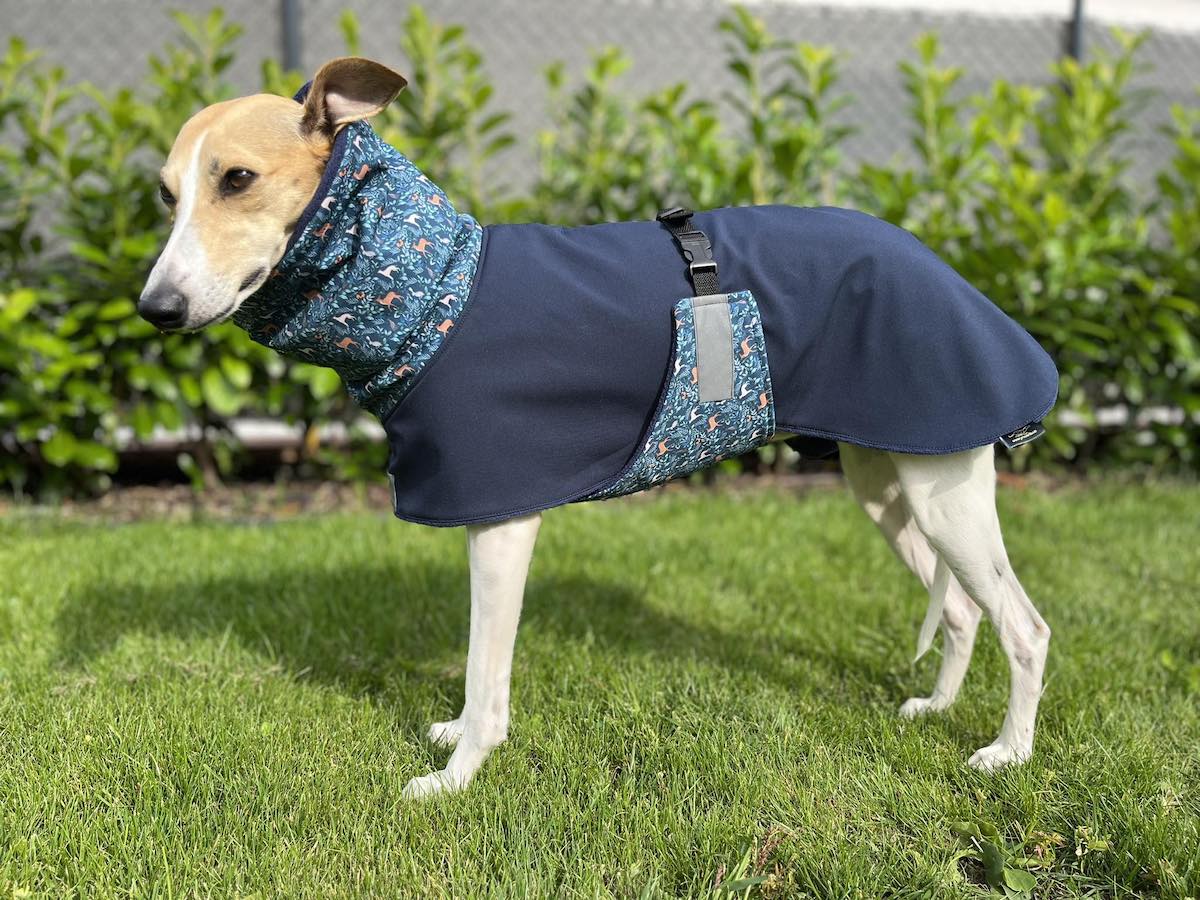 Luxusní extra teplá nepromokavá zimní bunda s autorským potiskem chrtů v lese.