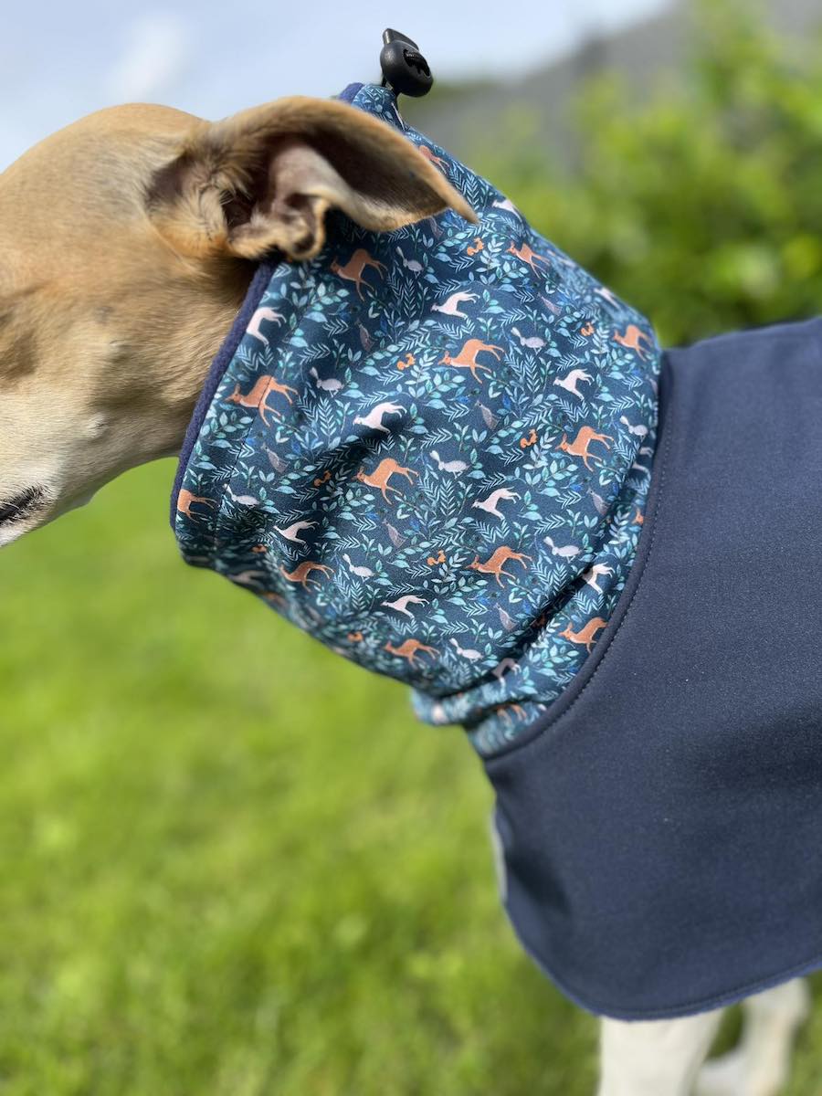 Luxusní extra teplá nepromokavá zimní bunda s autorským potiskem chrtů v lese.