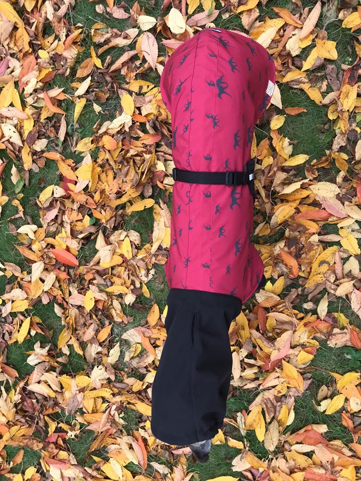 Bundička je navržena v elegantním sportovním provedení. Zapínání je na sponu - nastavitelný obvod hrudníku. Bunda má anatomické tvarování ve hřbetní a ocasní části, proto se perfektně přizpůsobí pohybu psa, aniž by se nadzvedávala zadní část bundy. Přední část bundy je upravena k co největšímu pohybu psa (běhání, skákání) a zapínání na břišní části upraveno tak, aby nebylo znečištěno při vykonávání potřeby (ocení zejména majitelé psů). Bundička má návlek na celý krk, jehož obvod je možno nastavit dle potřeby. Obleček je doplněn otvorem pro upevnění vodítka k obojku. Spodní podbřišníková část je plně odepínací - není třeba tedy prát celý obleček, ale jen tuto spodní část. K oblečku je také možné dokoupit náhradní podbrišníkový díl.