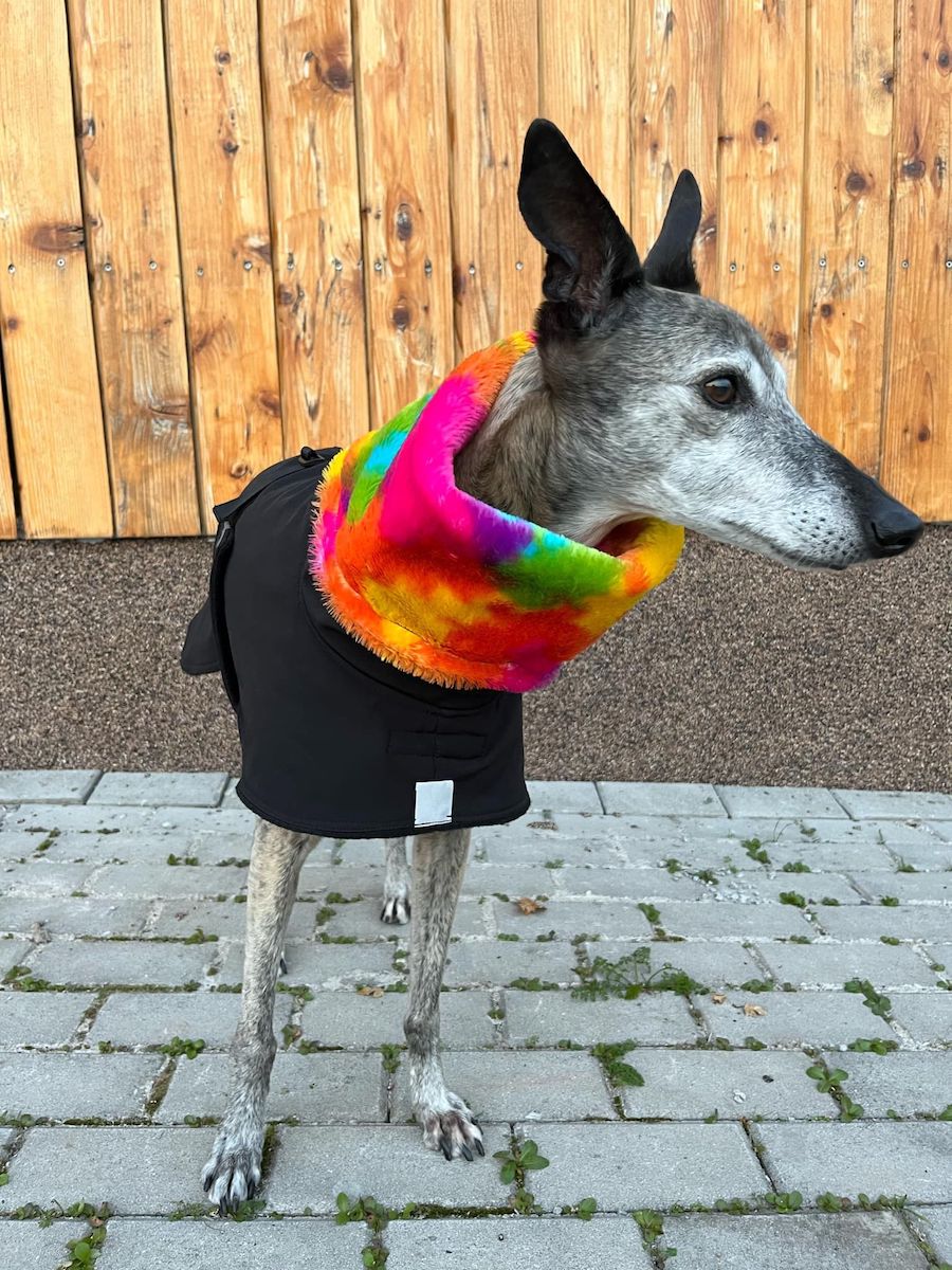 Svrchní vrstva bundy je z nepromokavého materiálu zimní softshell nejvyšší kvality. Spodní vrstva oblečku je tvořena teplým fleecem v duhové barvě.