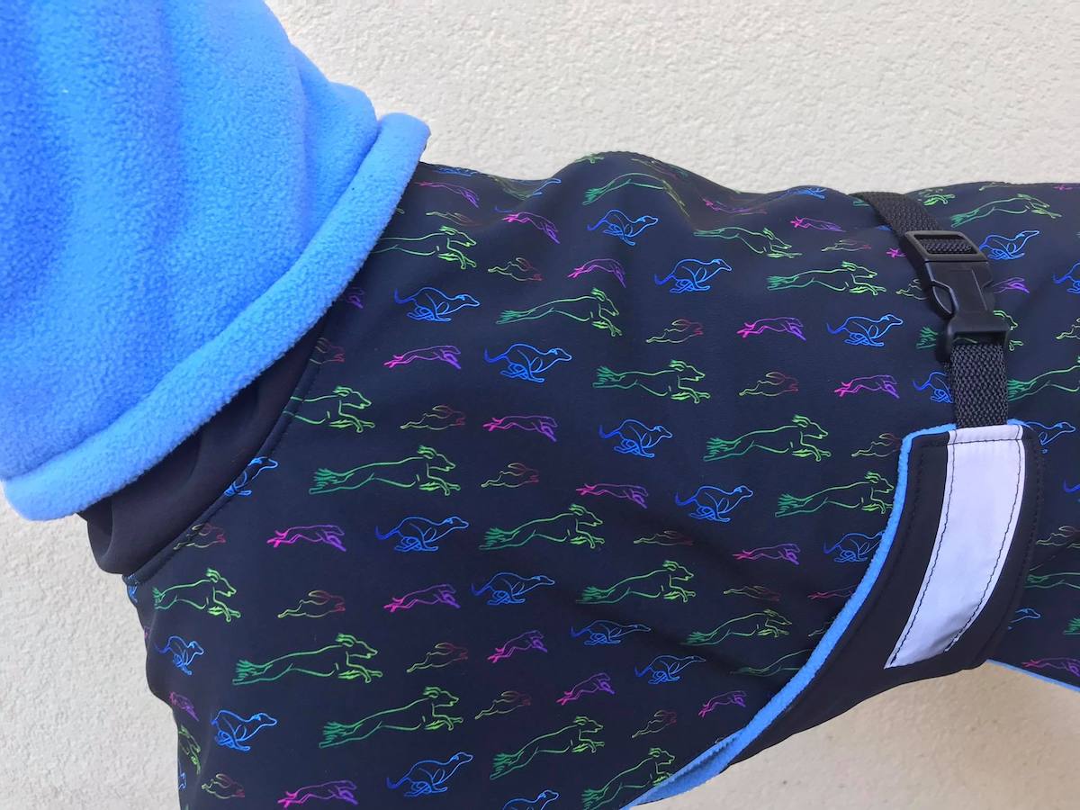 Luxusní extra teplá nepromokavá zimní bunda s autorským potiskem duhových chrtů v kombinaci černého softshellu a modrého fleecu.