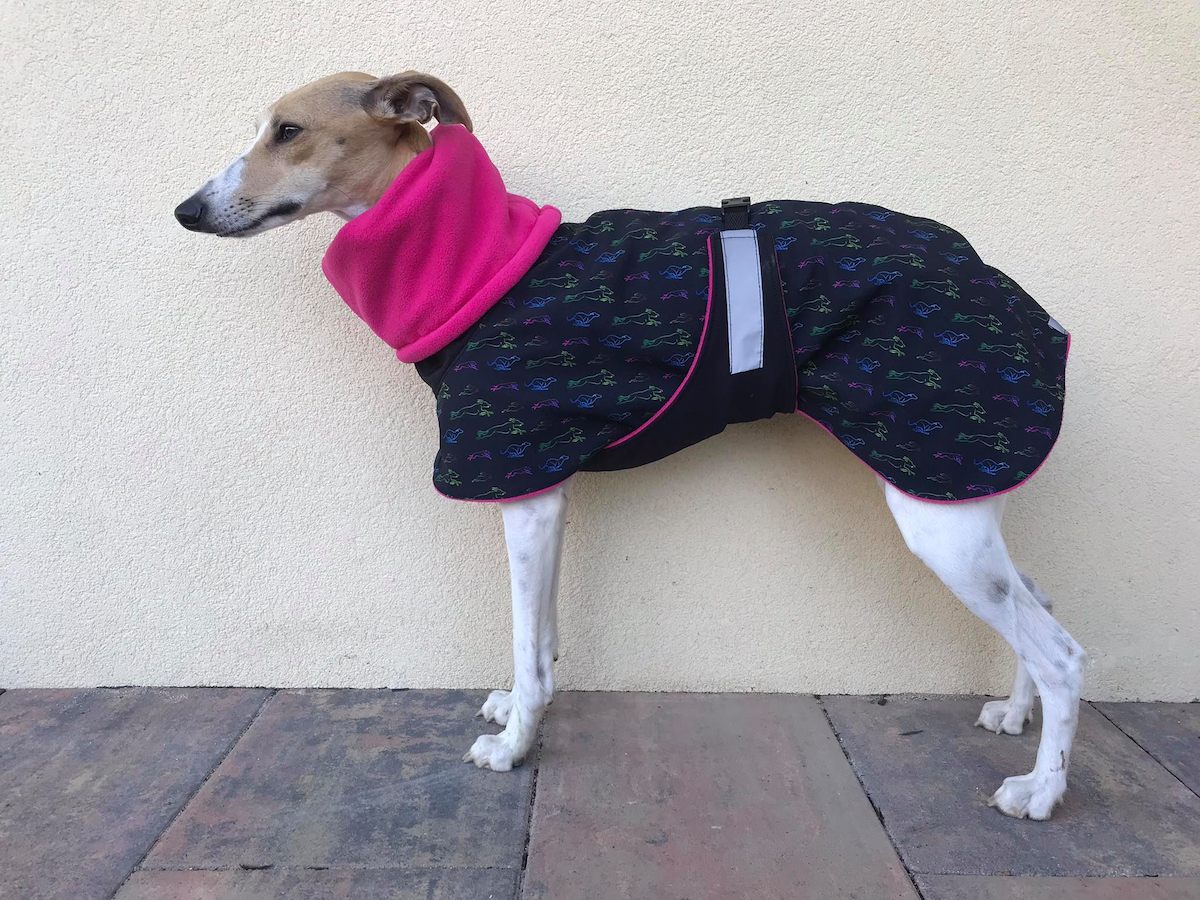 Zimní bunda s duhovým potiskem chrtů v kombinaci černé a růžové...