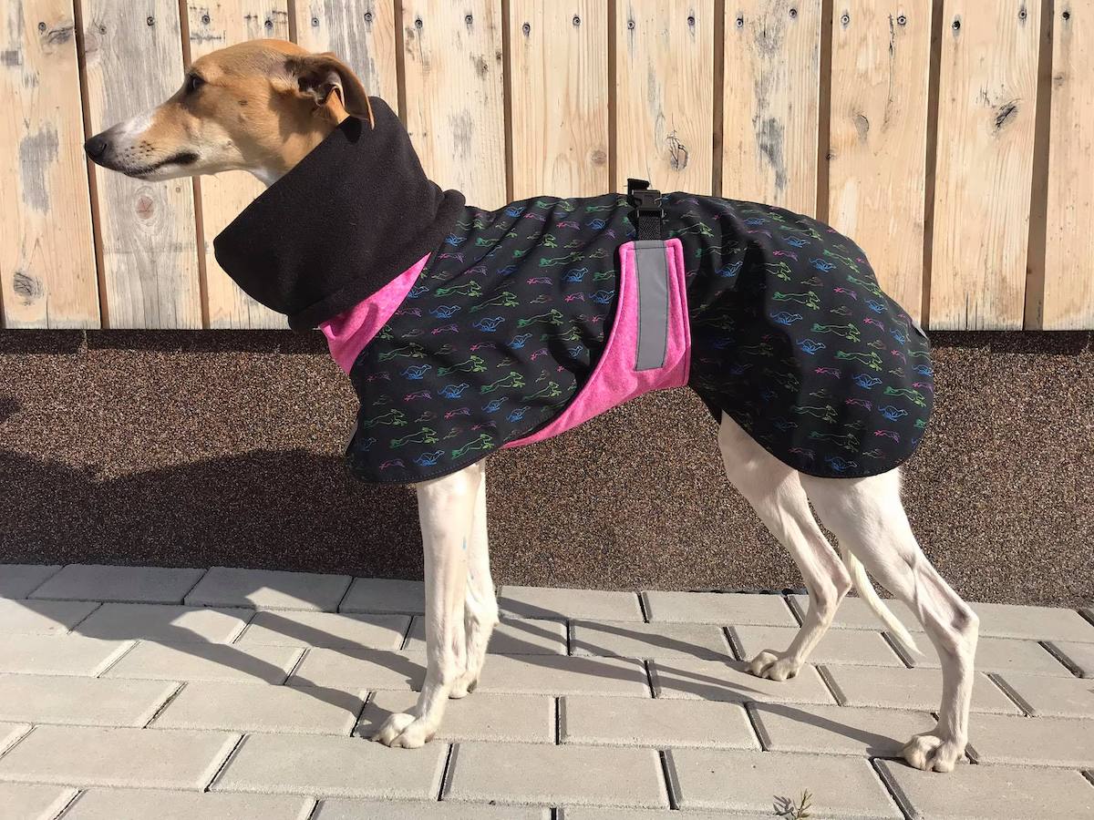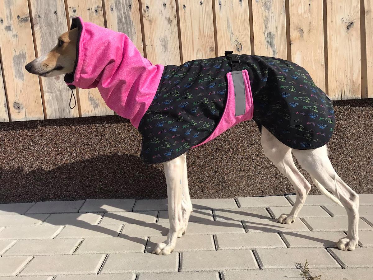 Zimní bunda s duhovým potiskem chrtů v kombinaci s růžovým softshellem s jemným melírem...