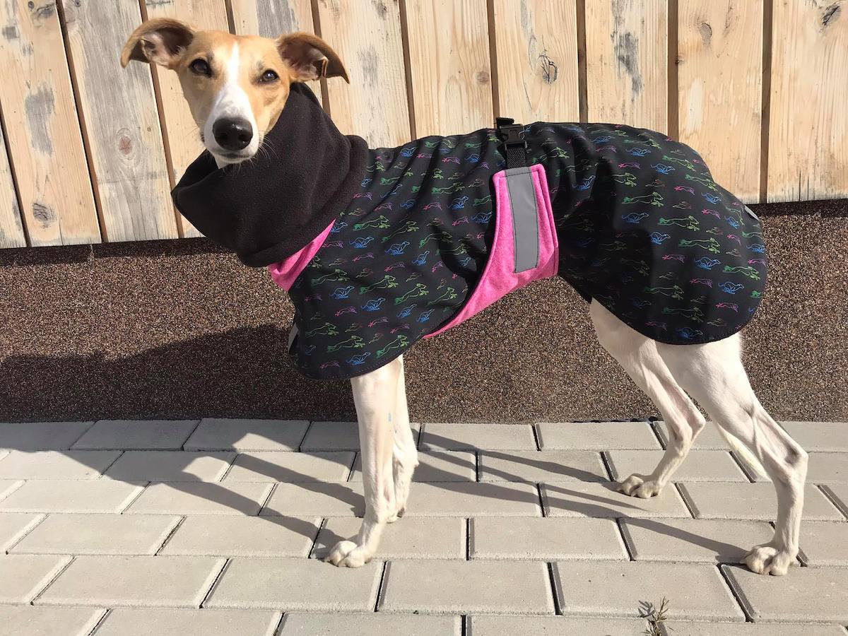 Zimní bunda s duhovým potiskem chrtů v kombinaci s růžovým softshellem s jemným melírem...