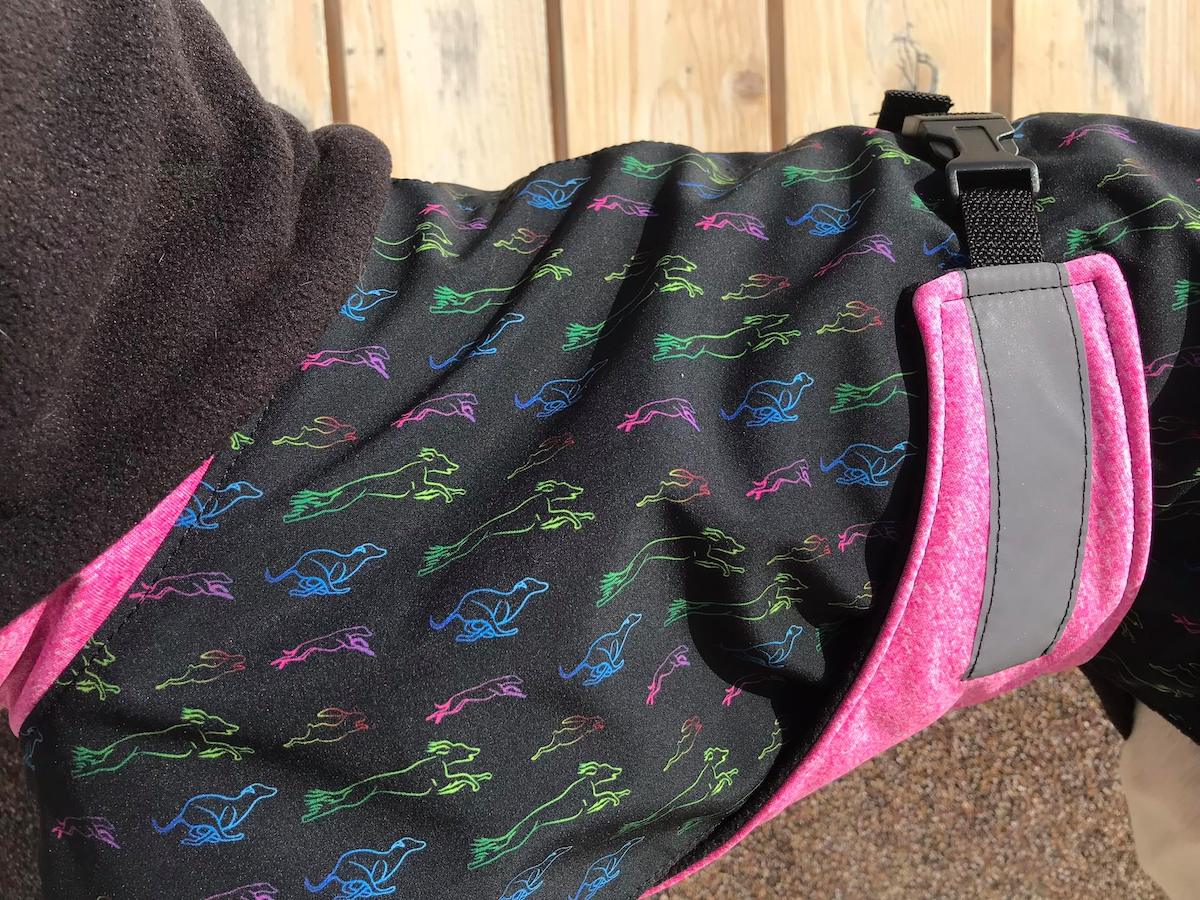 Zimní bunda s duhovým potiskem chrtů v kombinaci s růžovým softshellem s jemným melírem...